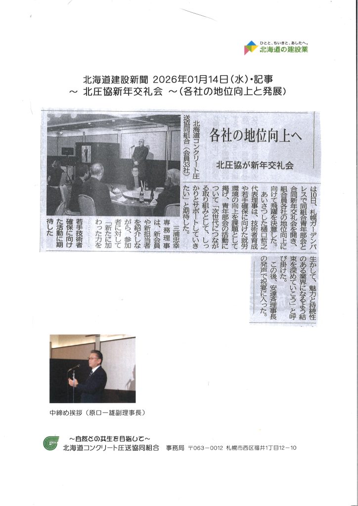北海道建設新聞 2026年01月14日(水)・記事~ 北圧協新年交礼会~(各社の地位向上と発展)