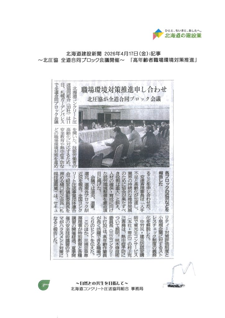 北海道建設新聞 2026年04月16日(木)~ 北圧協全道合同ブロック会議~ 「高年齢者職場環境対策推進」